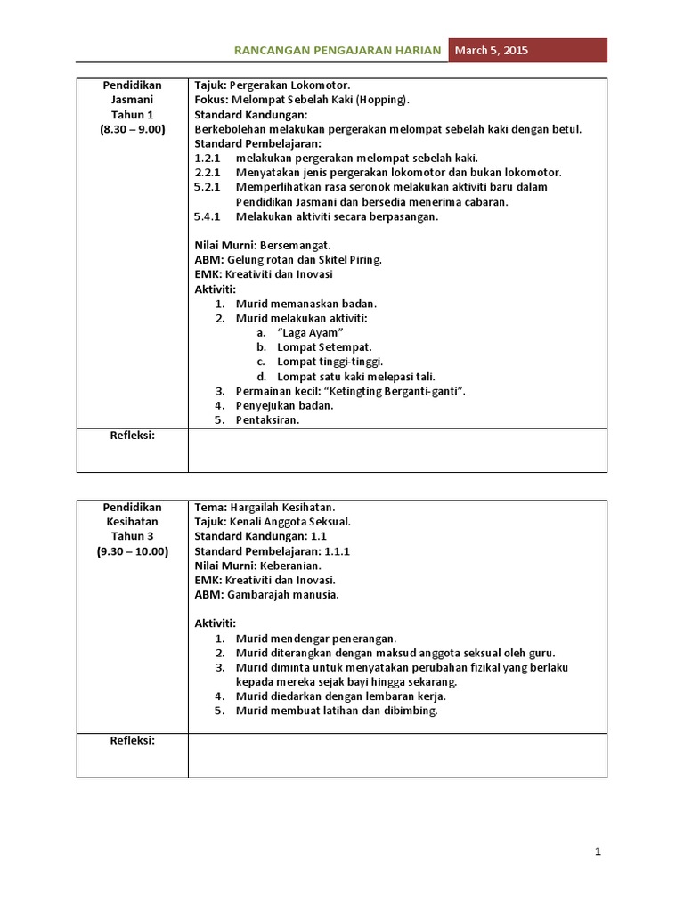 Doc Rancangan Pelajaran Harian Pjpk Komponen Pj Tahun 1 Semakan Minggu 9 Desmond Daniel Academia Edu