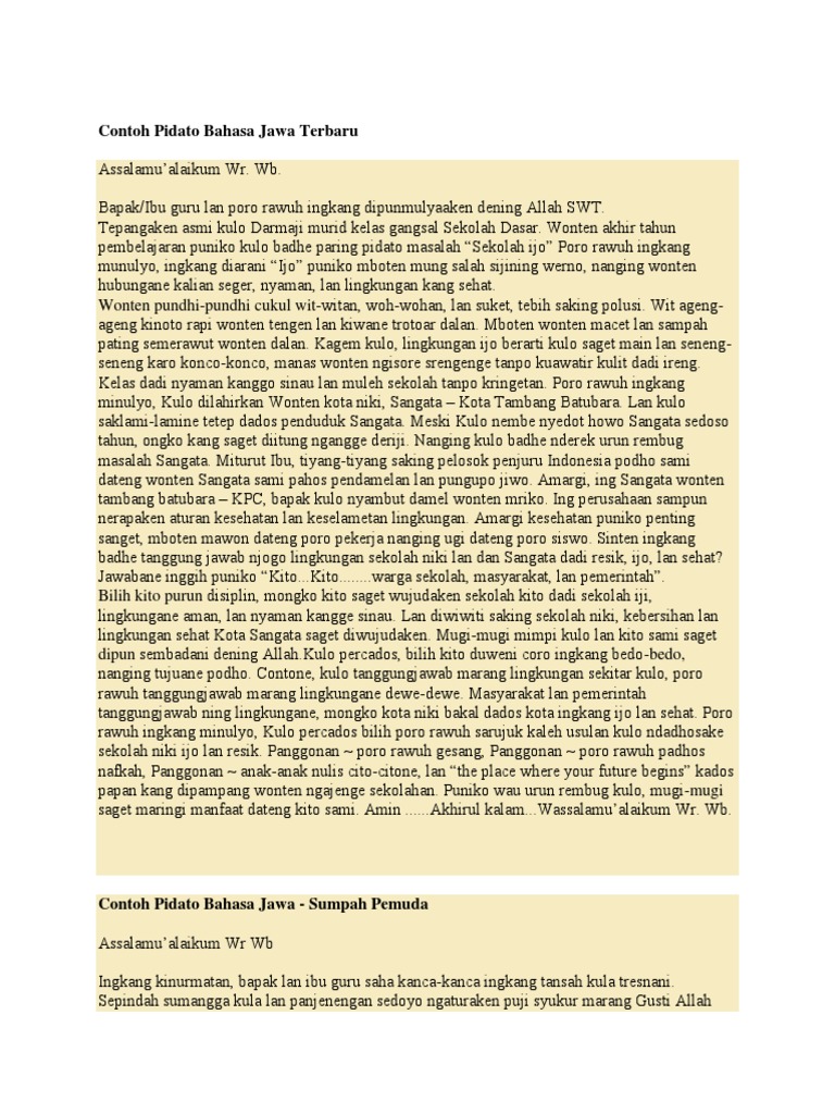 Contoh pidato bahasa jawa krama selanjutnya adalah tentang budi pekerti. Hadirin yang dihormati sekelian mengapakah bahasa itu dikatakan jiwa atau roh bangsa. Terima kasih saudara i pengacara majlis. Jiwa bermaksud nyawa atau roh.